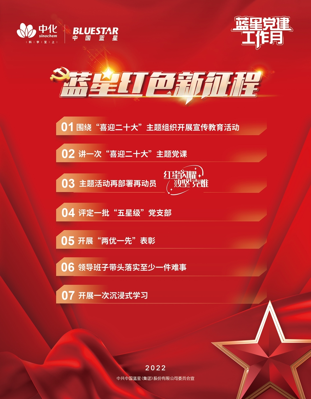 堅持黨的領(lǐng)導(dǎo)、加強黨的建設(shè),是國有企業(yè)的“根”和“魂”。2018年以來,藍星公司將每年7月確定為“黨建工作月”,有針對性地設(shè)置活動主題、特色工作,創(chuàng)新思路與方法,使黨建工作與時俱進,有效激發(fā)公司各級黨組織、廣大共產(chǎn)黨員發(fā)揮戰(zhàn)斗堡壘和先鋒模范作用,有力推進黨建工作與生產(chǎn)經(jīng)營深度融合,形成了具有藍星特色的黨建工作品牌。今年的“黨建工作月”落實中國中化黨建工作部署,緊密圍繞“藍星紅色新征程”主題,號召各級黨委結(jié)合本單位實際深入開展“七個一”活動,以優(yōu)異的成績迎接黨的二十大的勝利召開。